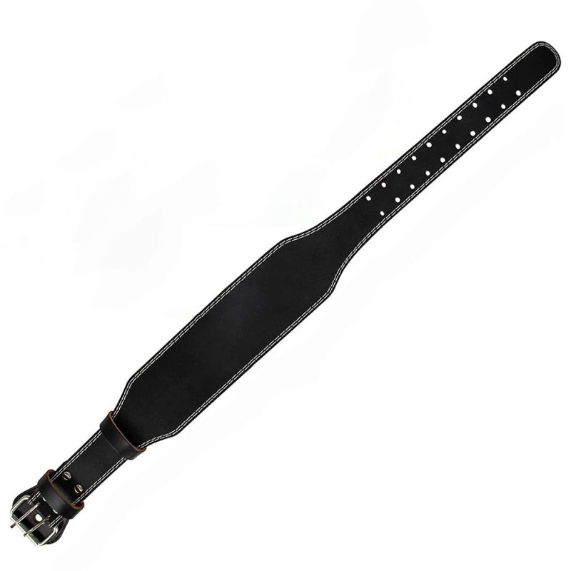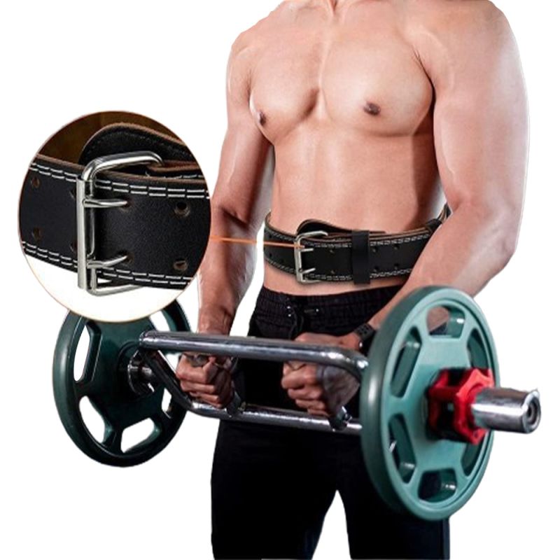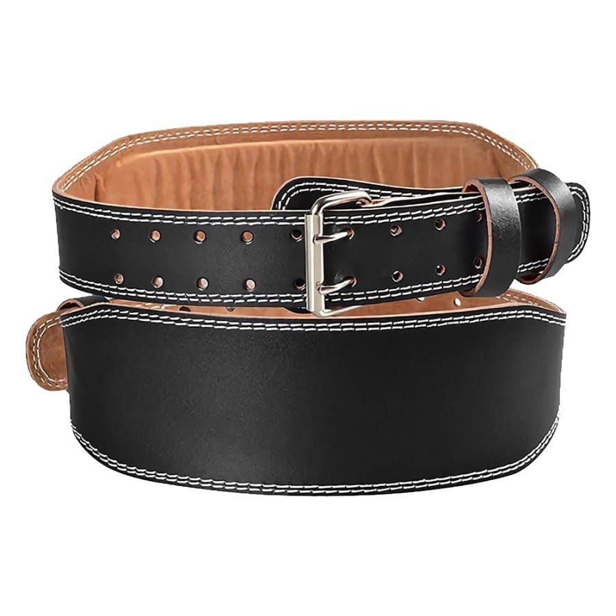 Durable leather belt providing lower back support during weightlifting, reducing injury risk and improving stability.